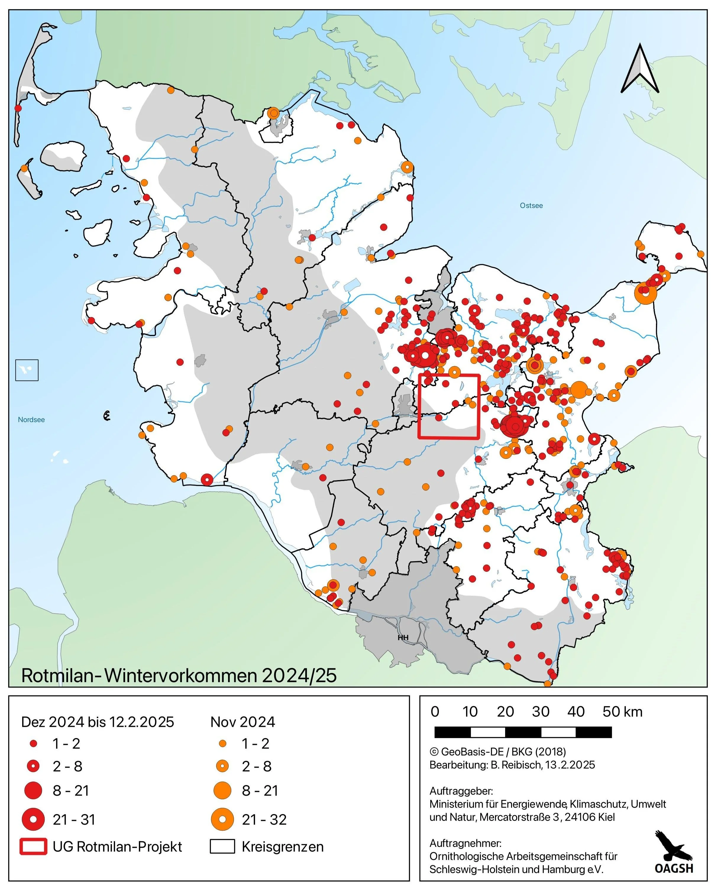 Am europaweiten Zählwochenende am 4. und 5. Januar 2025 wurden in den drei Gebieten 20 Rotmilane an der Obertrave/SE, 14 südöstlich von Kiel/PLÖ und 18 nordöstlich von Bordesholm/RD erfasst. Ein Anwohner sichtete im Dezember an der Obertrave/SE Rotmilangruppen von bis zu 40 Individuen und wir konnten bei Bordesholm/RD im Februar 32 Rotmilane beobachten.