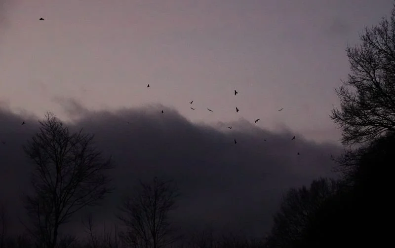 Rotmilangruppe aus dem Sammelgebiet Bordesholm/RD, die sich bei zunehmender Dunkelheit aus ihren westlich gelegenen Vorsammelpätzen erhebt, um gemeinsam kreisend zum ca. 300 m entfernten Schlafwald zu fliegen.