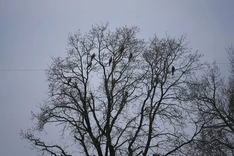 Rotmilane des im letzten Herbst neu entdeckten Sammelgebietes im Südosten Kiels in einem Vorsammelbaum.