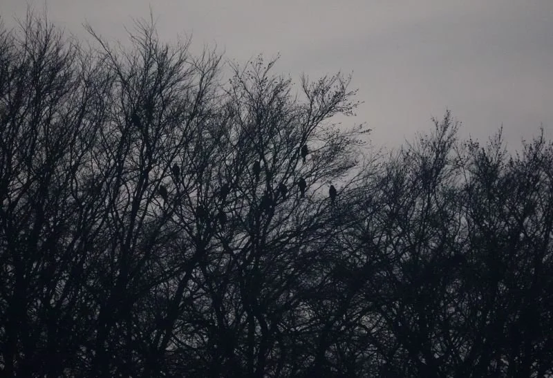 ... die bei schnell einsetzender Dunkelheit nach und nach an einem Vorsammelplatz eintrafen (Foto von 17.13 Uhr) und dann einzeln oder zu zweit zum Schlafwald flogen.