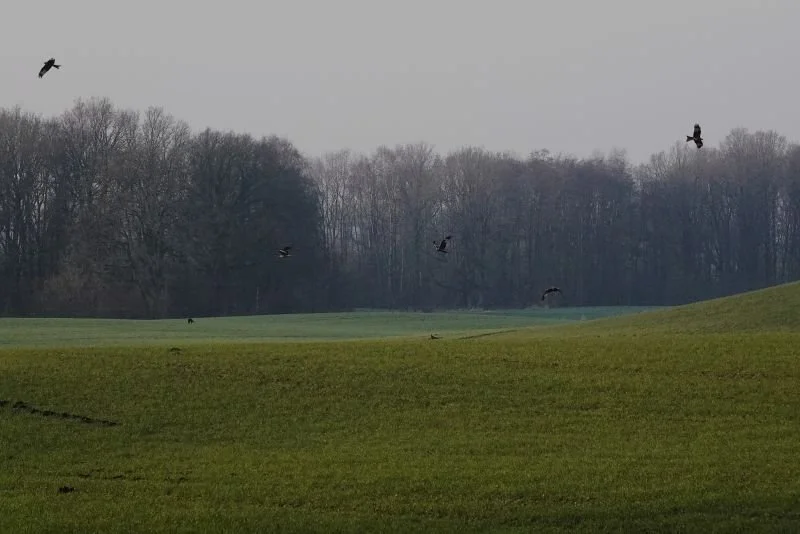 Rotmilane des Bordesholmer Gebietes während der ca. 2 km von ihrem Schlafwald entfernten Nahrungssuche (Foto von 16.09 Uhr) ...