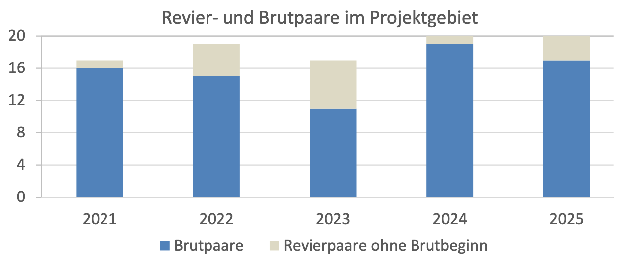 (1) Entwicklung des Brutbestandes auf der Projektfläche (300 km2) von 2021 bis 2025 unter Berücksichtigung der Revierpaare.