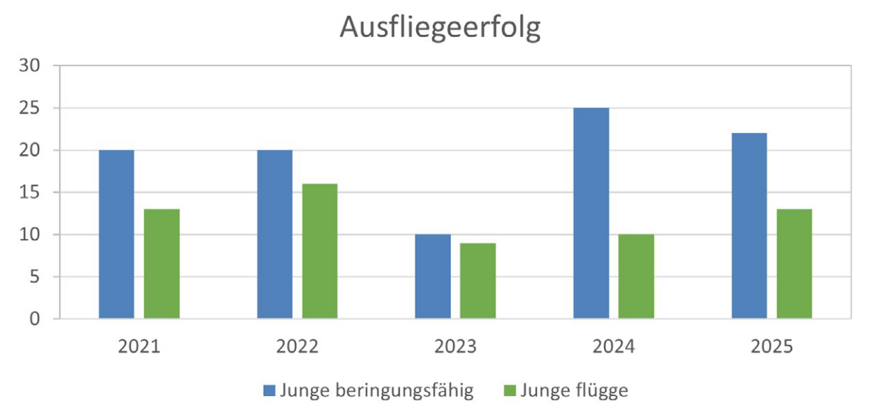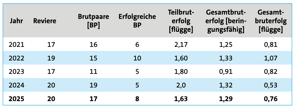 Im Jahr 2025 waren von 17 Brutpaaren auf der Projektfläche acht Paare erfolgreich. Von insgesamt 22 Jungvögeln, die das beringungsfähige Alter von 3 bis 5 Wochen erreicht hatten, wurden 13 Jungvögel tatsächlich flügge (Abbildung 2). Unter Berücksichtigung der ausgeflogenen Jungvögel zeigt der durchschnittliche Gesamtbruterfolg in 2025 den zweitniedrigsten Wert im Untersuchungszeitraum seit 2021 (Tabelle 1, Abbildung 3).