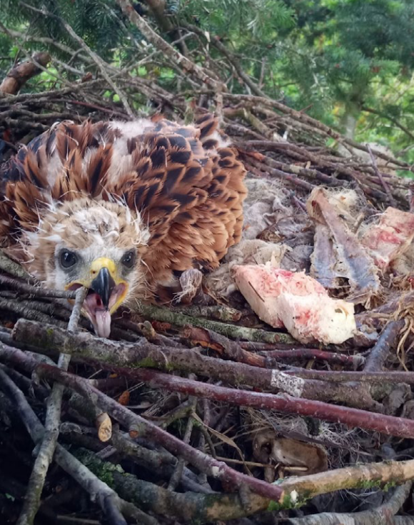 (4) Beringungsfähiger Jungvogel im Nest Fiefharrie/RD mit eingetragenen Schlachtabfällen. Foto: Thomas Grünkorn