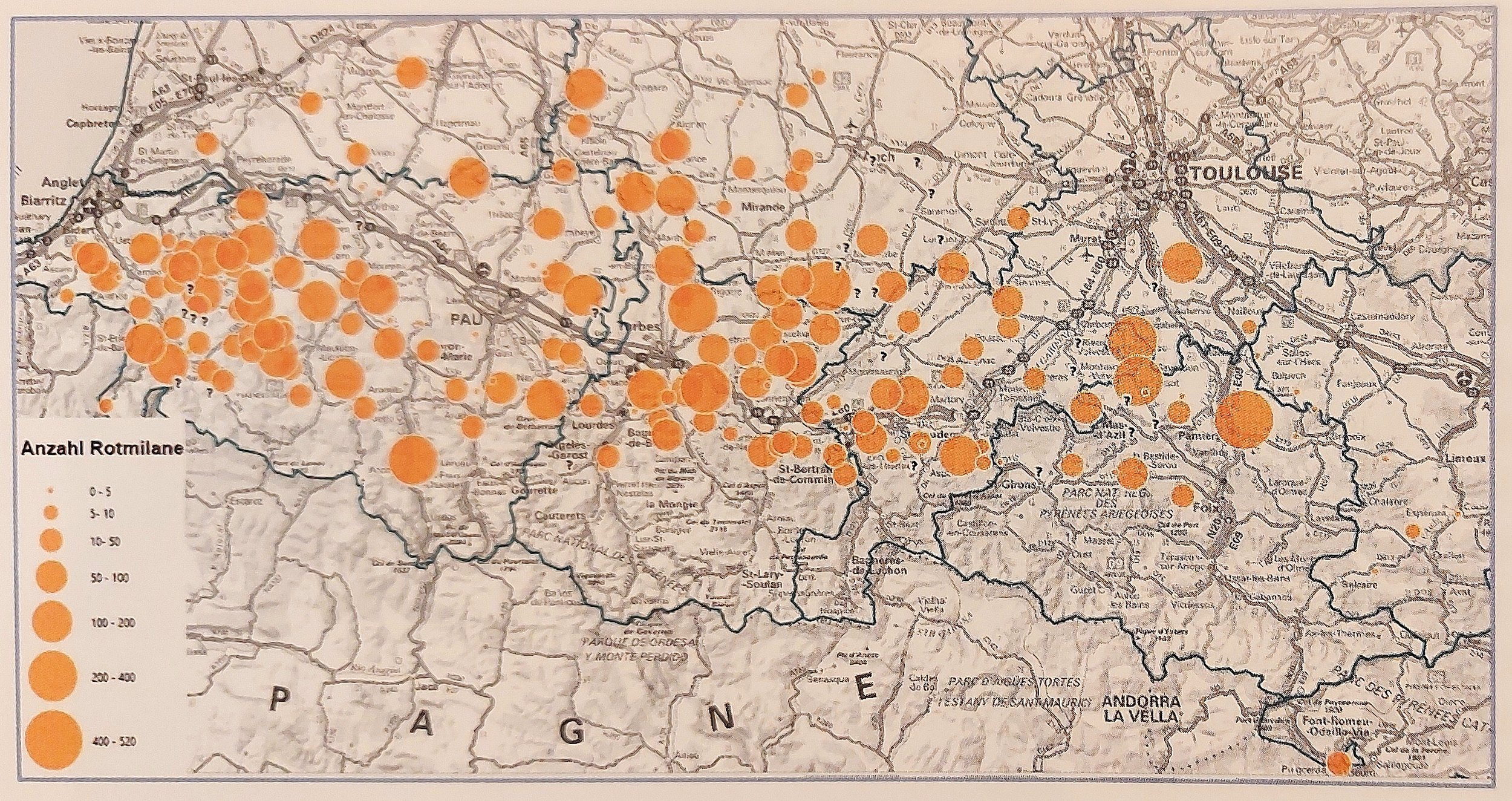 Verteilung der bekannten Winterschlafplätze am Nordrand der Pyrenäen im Januar 2021. Die unterschiedlichen Größen der Punkte stehen für verschiedene Schalfplatzgrößen. Die Karte ilustriert, wie viele Schlafplätze sich in manchen Regionen bilden und wie nahe diese beieinander liegen können. Karte aus Aebischer & Scherler 2023. Der Rotmilan. Réseau Pyrénées et départements limitrophes, C A. de Seynes, LPO France.