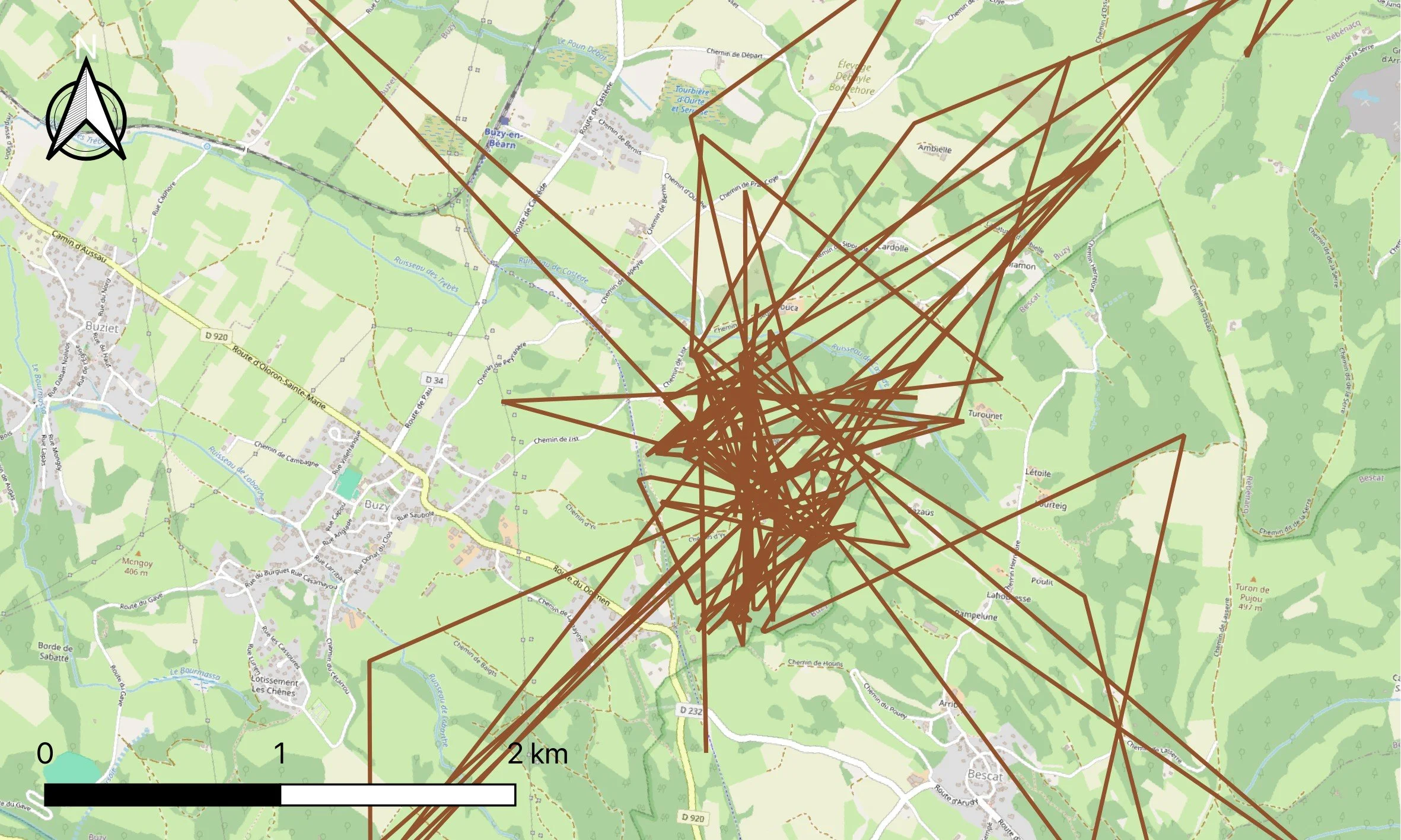 Ein letzter Gedanke: Ich bin fasziniert von dem graphischen Muster, das die Rotmilane in ihren Flugbewegungen zeigen. Meine Wahrnehmung ist, dass die Flugbewegungen, die die besenderten Rotmilane (auch andere Rotmilane bei movebank) hinterlassen artspezifisch einzigartig sind. Ich erkenne hier Besonderheiten bei den Rotmilanen: z. B.