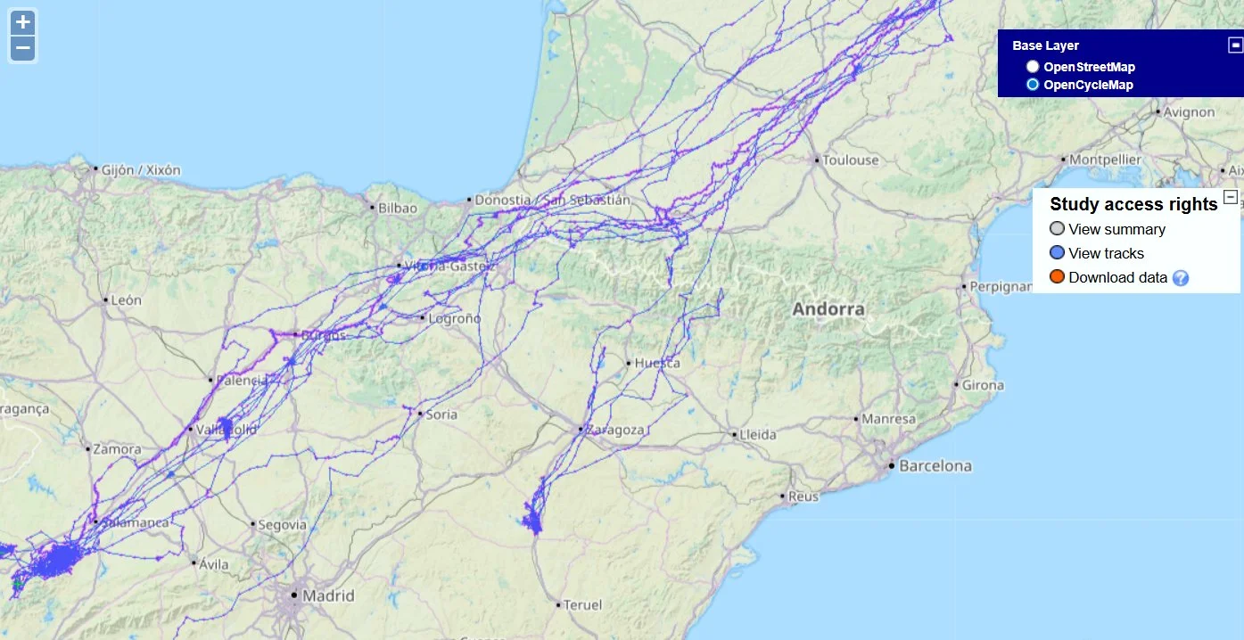 Die Routen einiger vom Team des Heineanum in Halberstadt besenderter Rotmilane bei Movebank.org