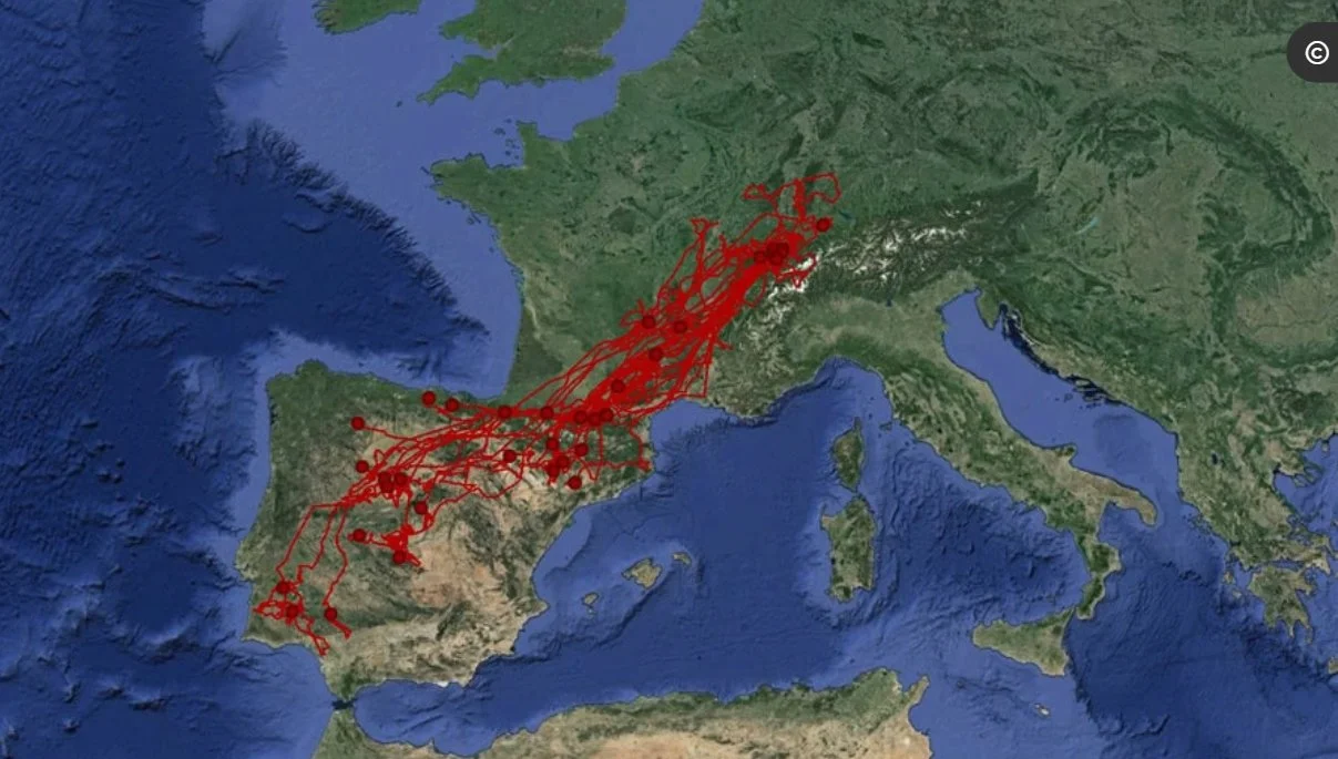 Meine ursprüngliche Vermutung, dass Rotmilane die Pyrenäen nur an den Küstenregionen überqueren, hat sich durch meine Recherchen inzwischen überhaupt nicht bestätigt. Dort sind zwar sehr wohl im Frühjahr und Herbst große Rotmilan-Flugbewegungen, aber auch mitten durch das Gebirge ziehen Rotmilane, offenbar sogar an allen Stellen wo Überquerungen in Talspalten möglich sind. Eine Karte von besenderten Rotmilanen der Schweizer Vogelwarte belegt dies eindrücklich.